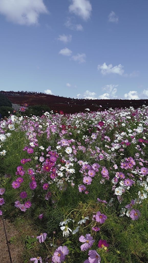 真っ赤に色づいたコキアと、一面に咲くコスモスがとてもきれいで、